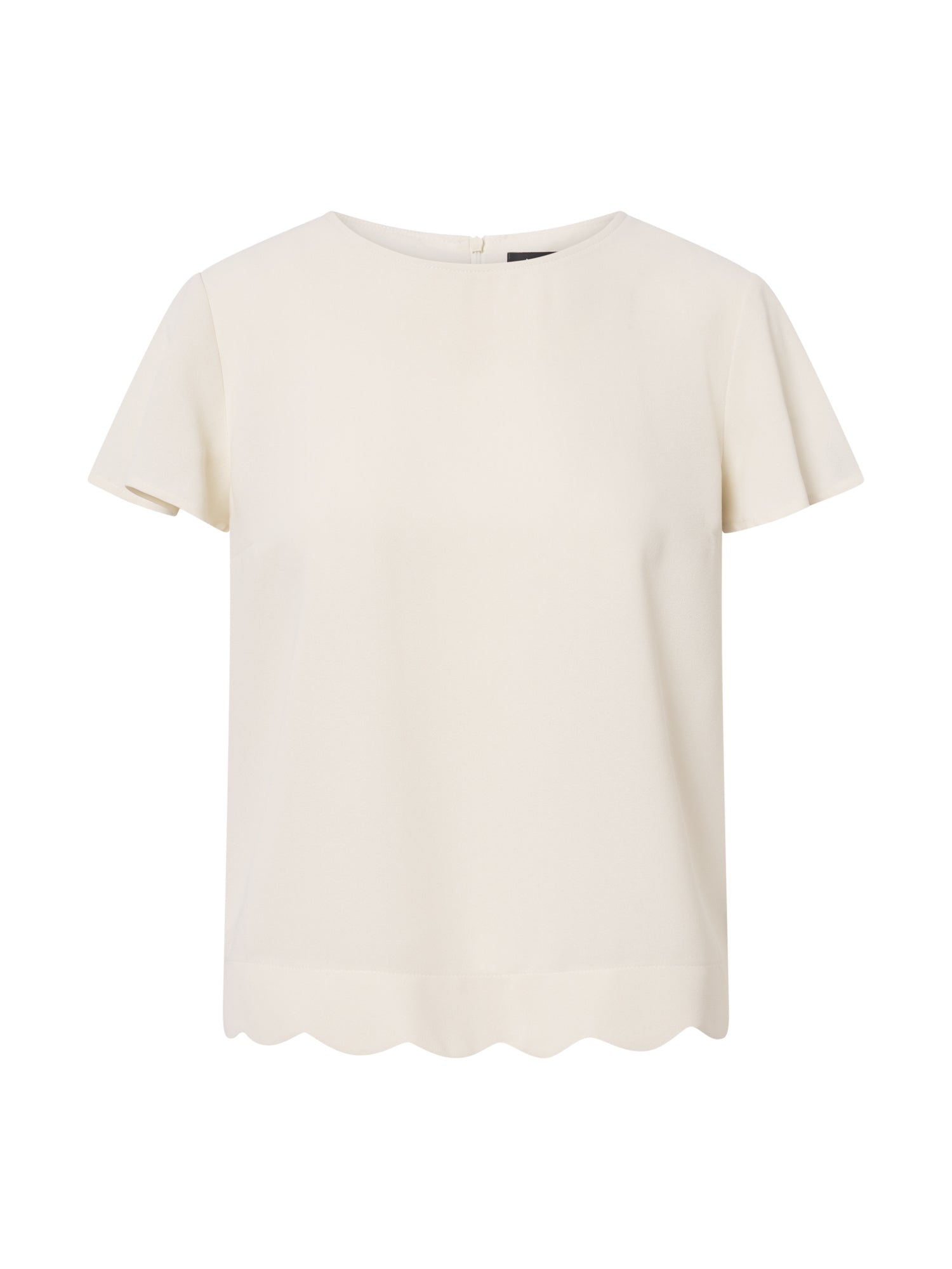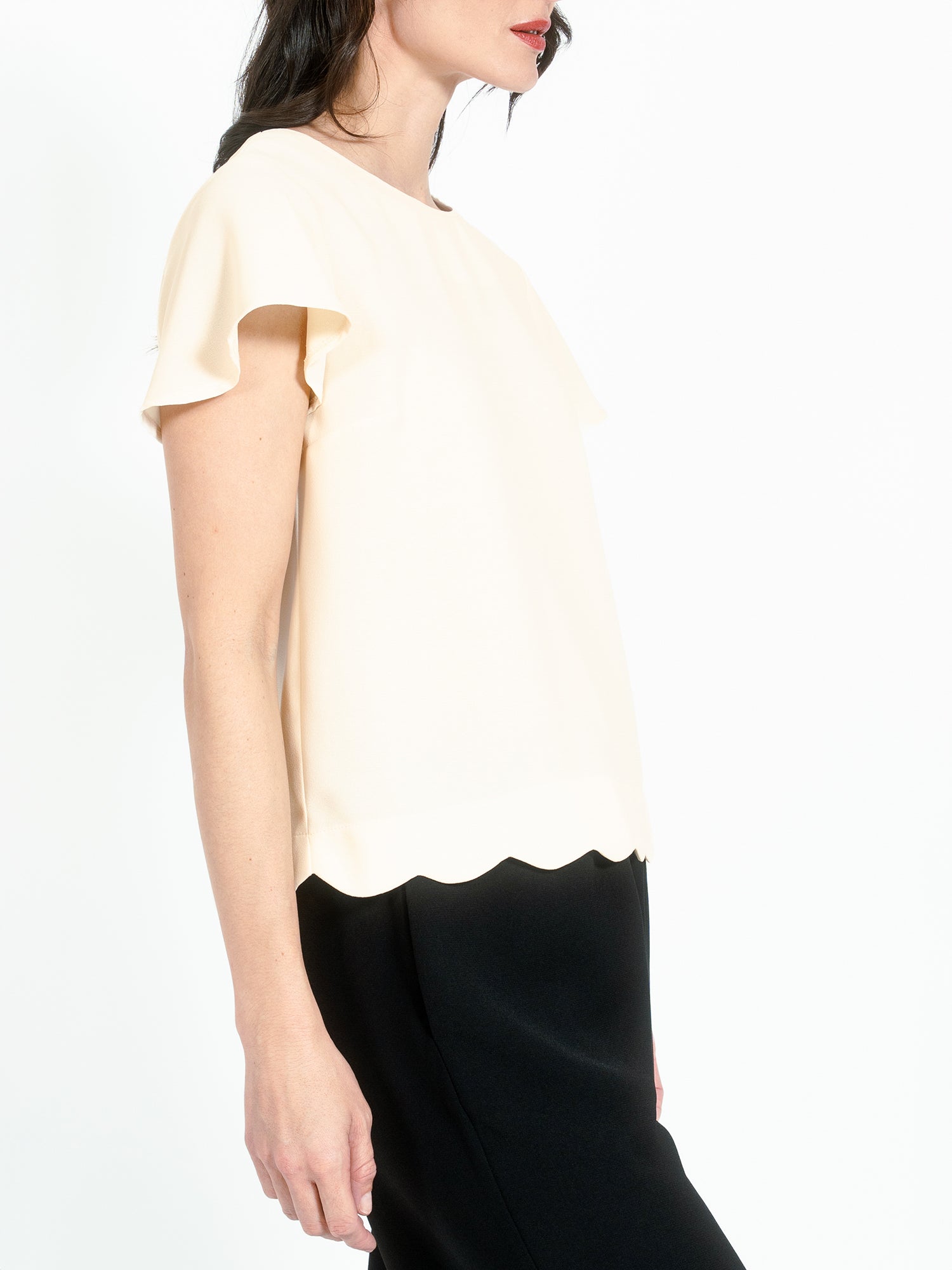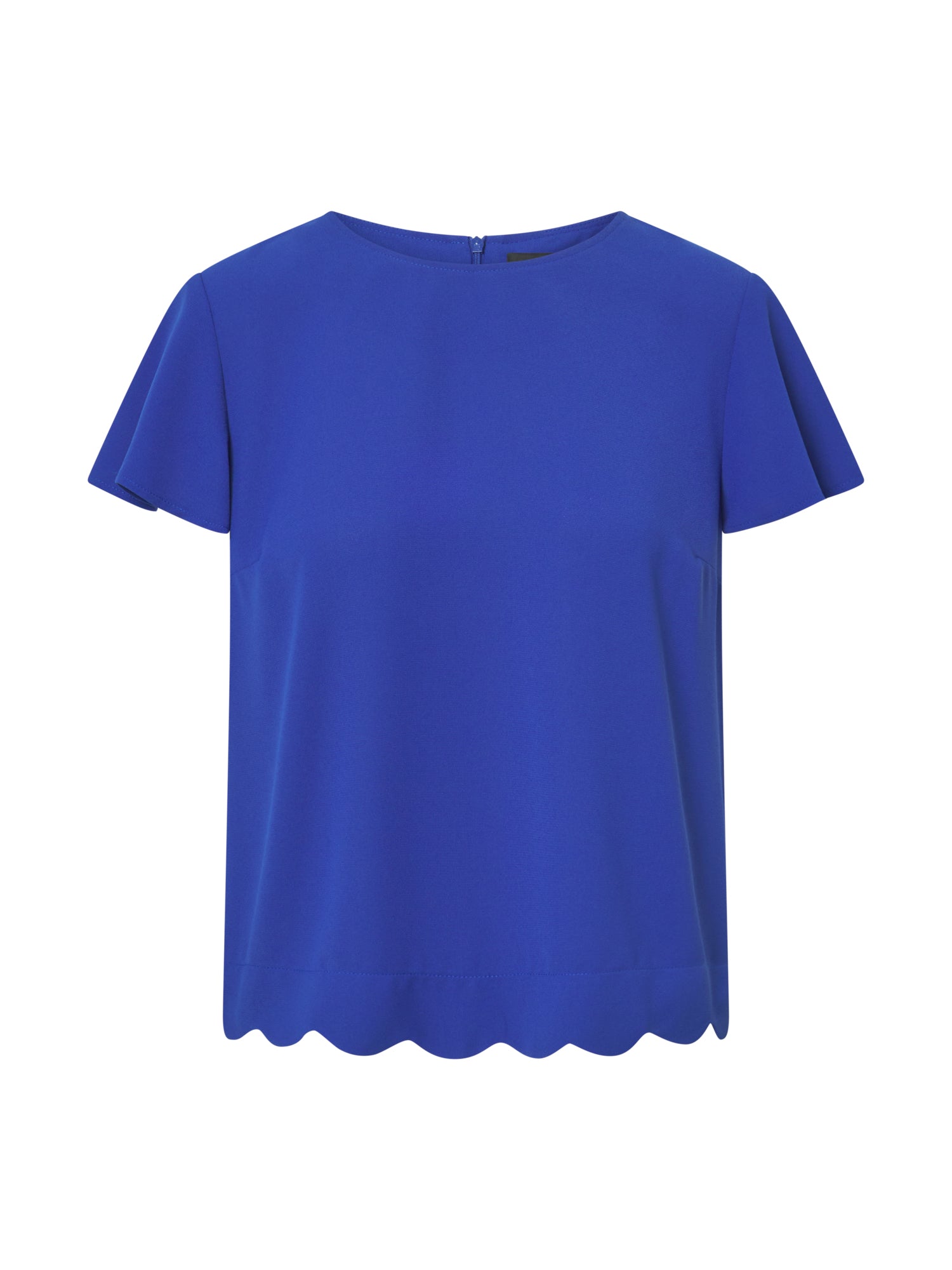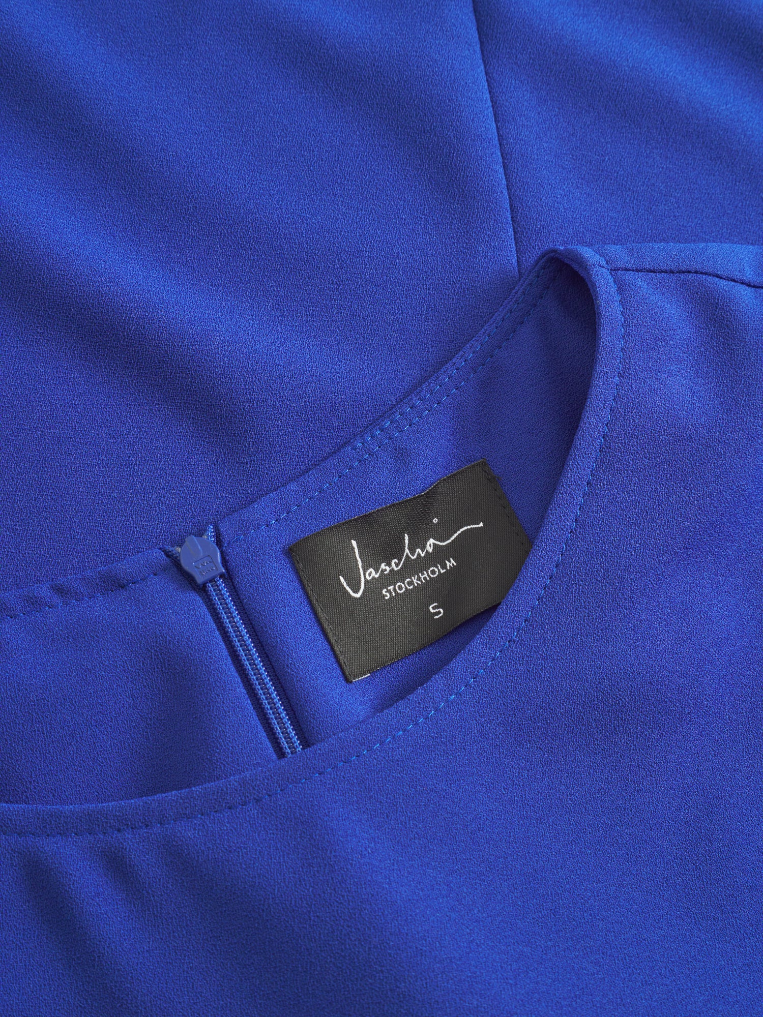 Bluse aus weichem Recycling-Polyester von Jascha Stockholm. Gerades Modell mit leicht kürzerer Passform und Rundhalsausschnitt. Die Bluse hat kurze Ärmel, einen dekorativen Wellensaum und einen verdeckten Reißverschluss am Rücken.
