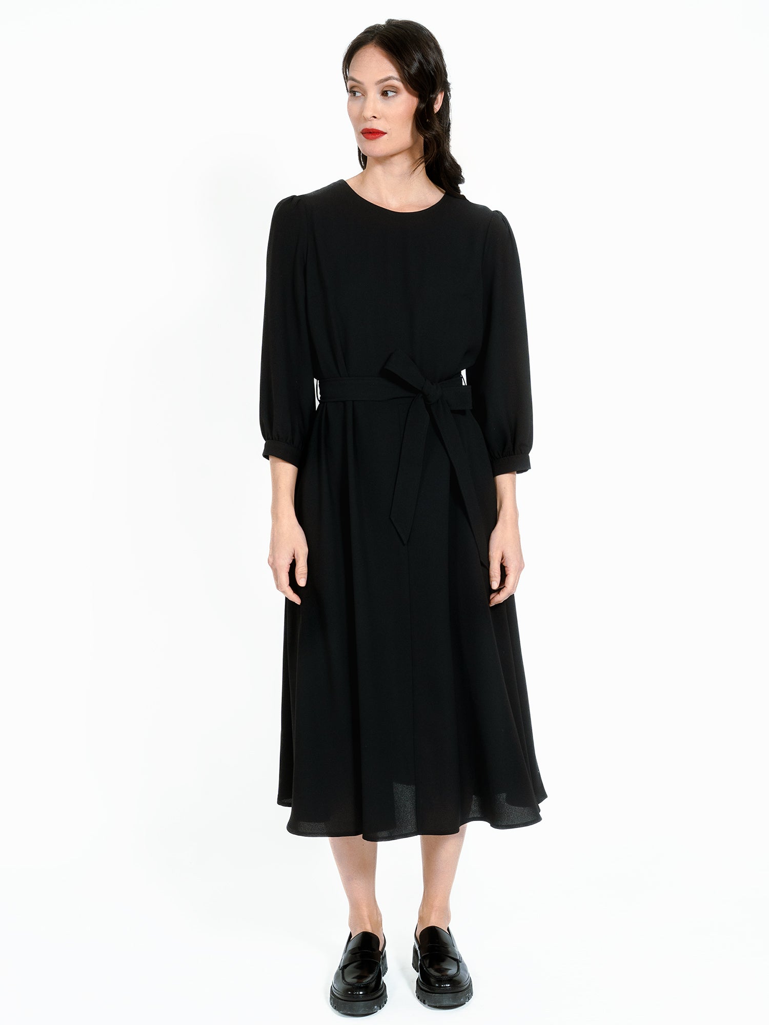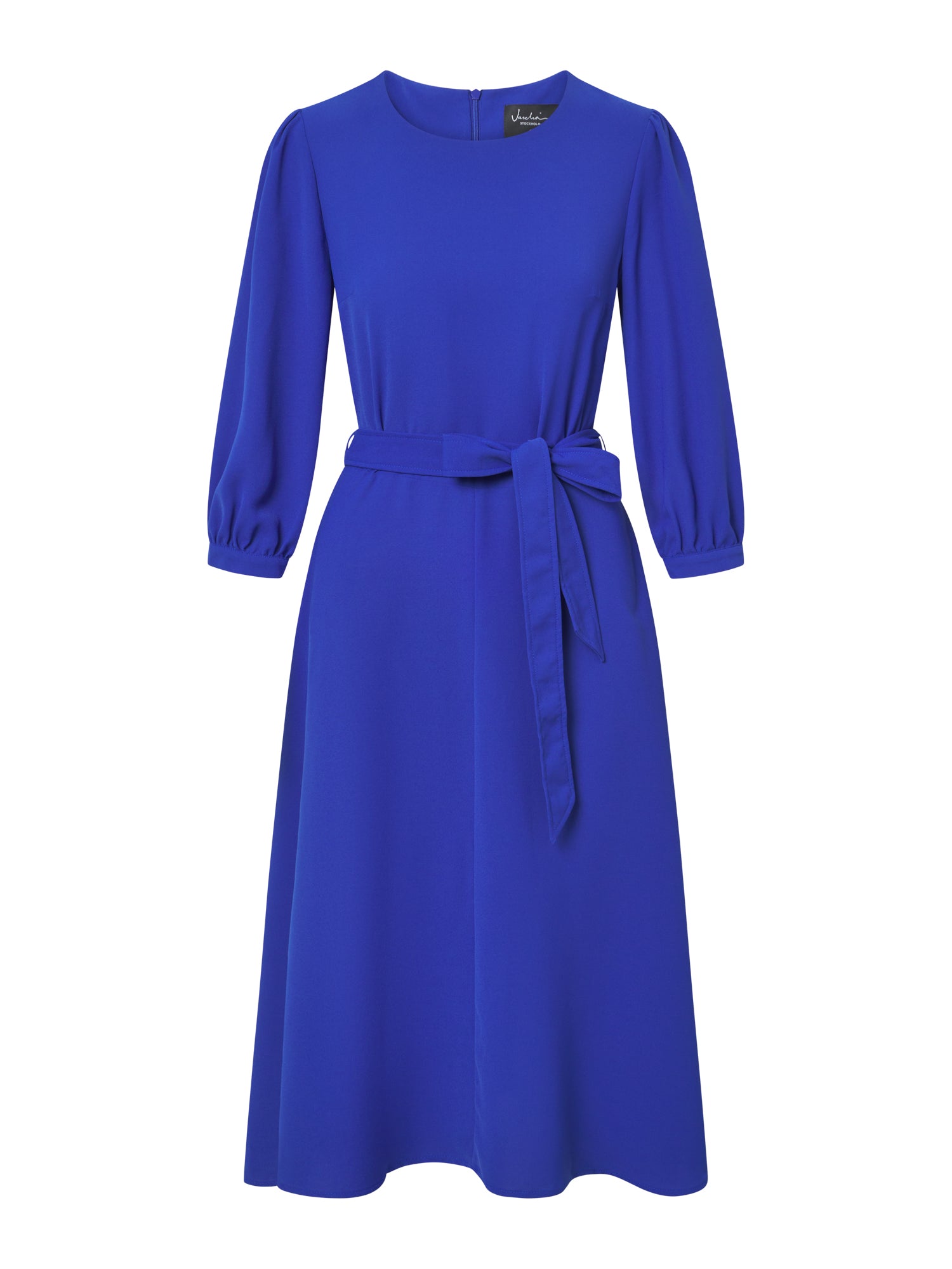 Kleid aus weichem Recycling-Polyester von Jascha Stockholm. A-Linien-Schnitt mit Taillenbund und Rundhalsausschnitt. Das Kleid hat Dreiviertelärmel mit Knöpfen an den Manschetten sowie einen verdeckten Reißverschluss am Rücken.