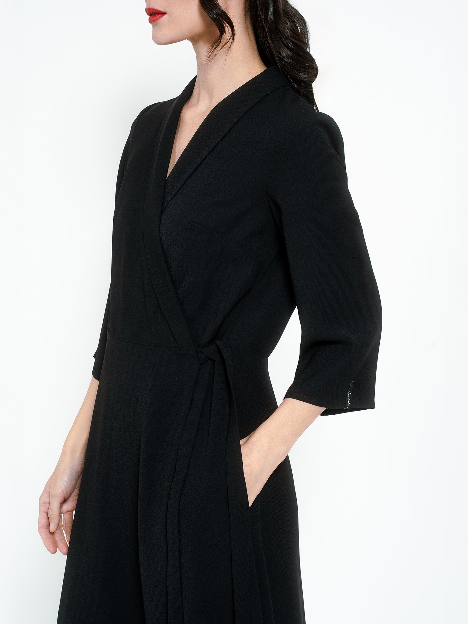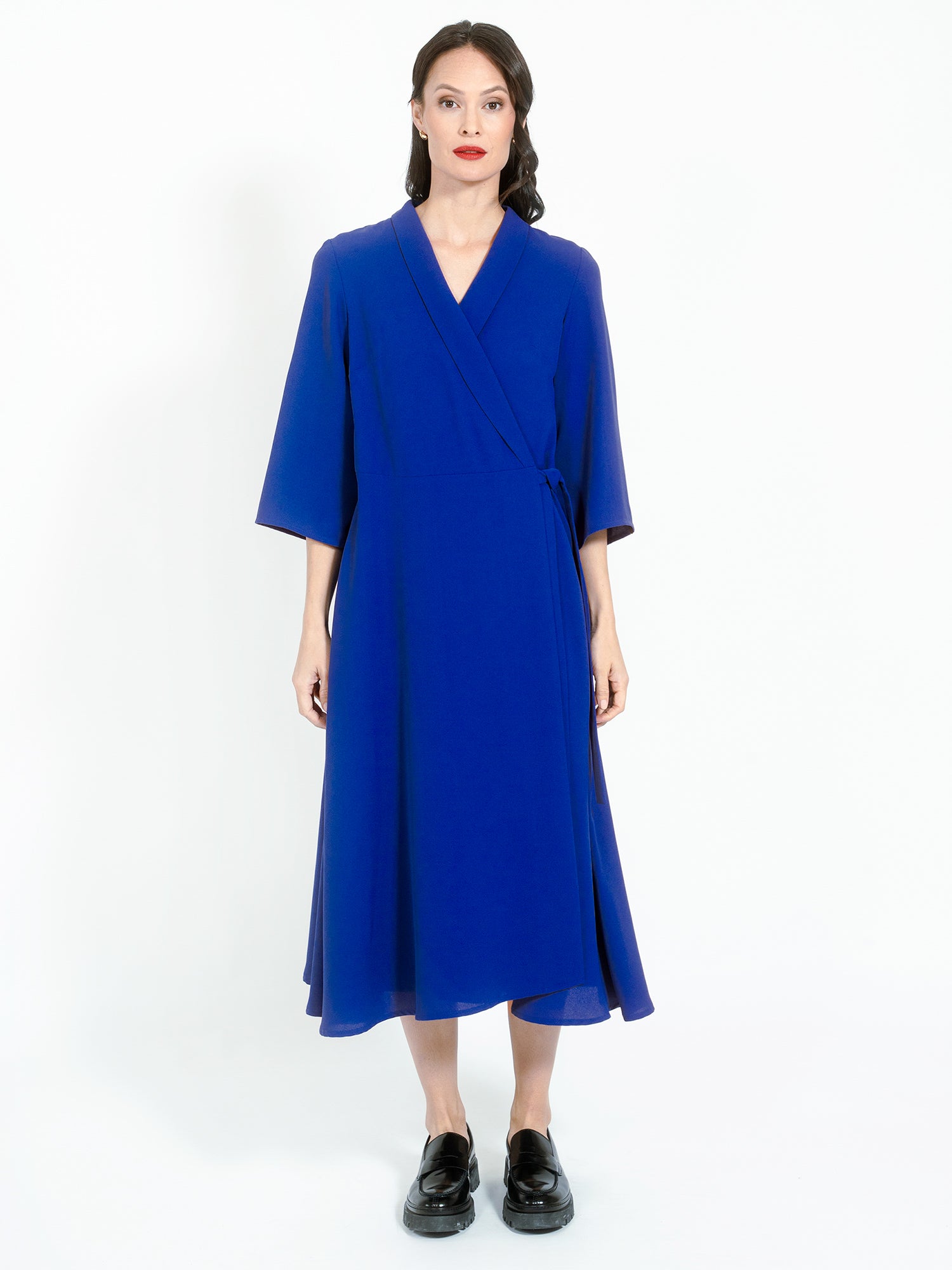 Kleid aus weichem, recyceltem Polyester von Jascha Stockholm. Wickelmodell in knöchellanger Länge. Das Kleid verfügt über einen Taillenbund und dreiviertellange Ärmel.