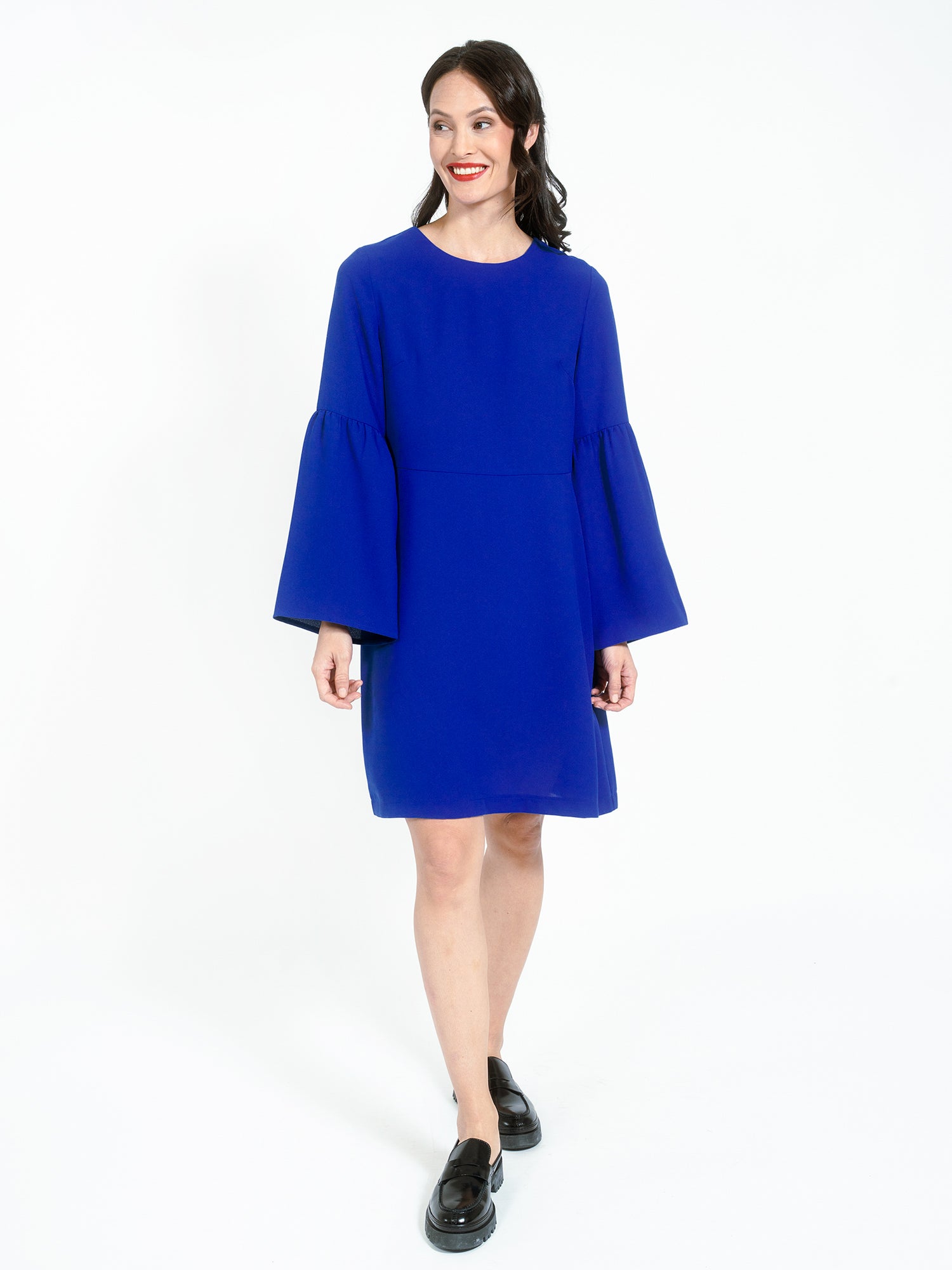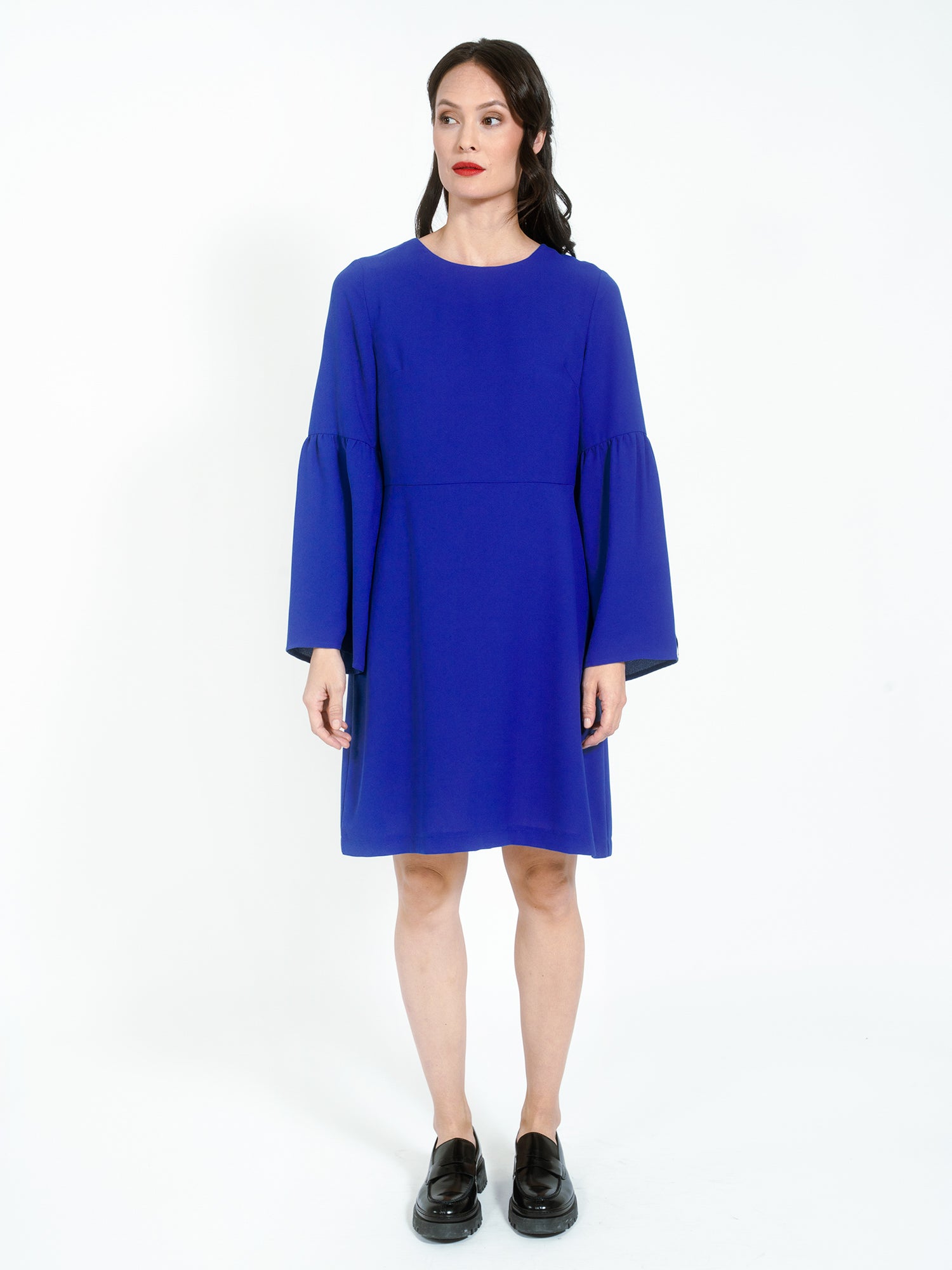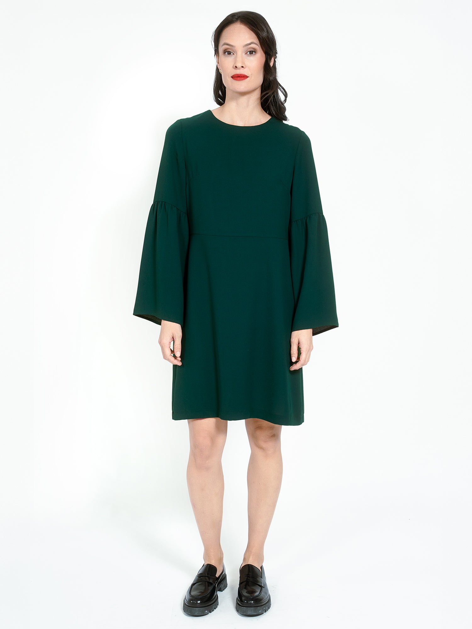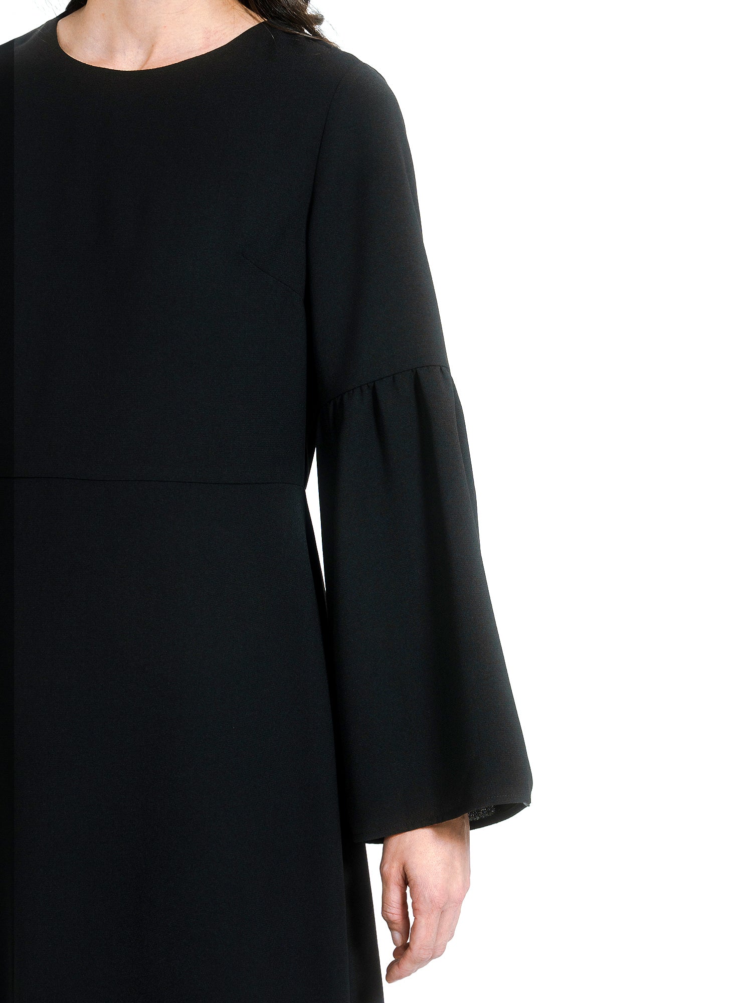 Knielanges Kleid aus weichem Recycling-Polyester von Jascha Stockholm. Leicht tailliertes Modell mit betonter Taille und langen, weiten Trompetenärmeln. Das Kleid hat einen verdeckten Reißverschluss am Rücken.
