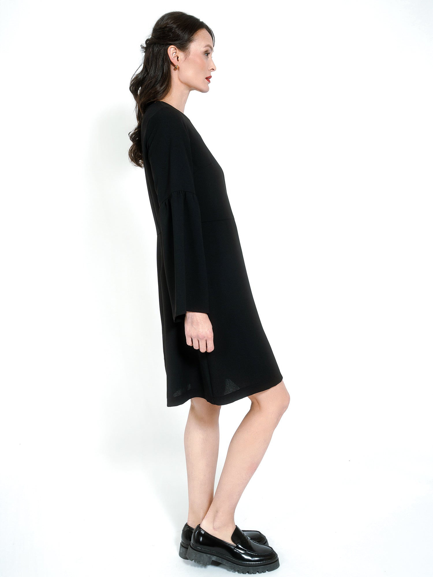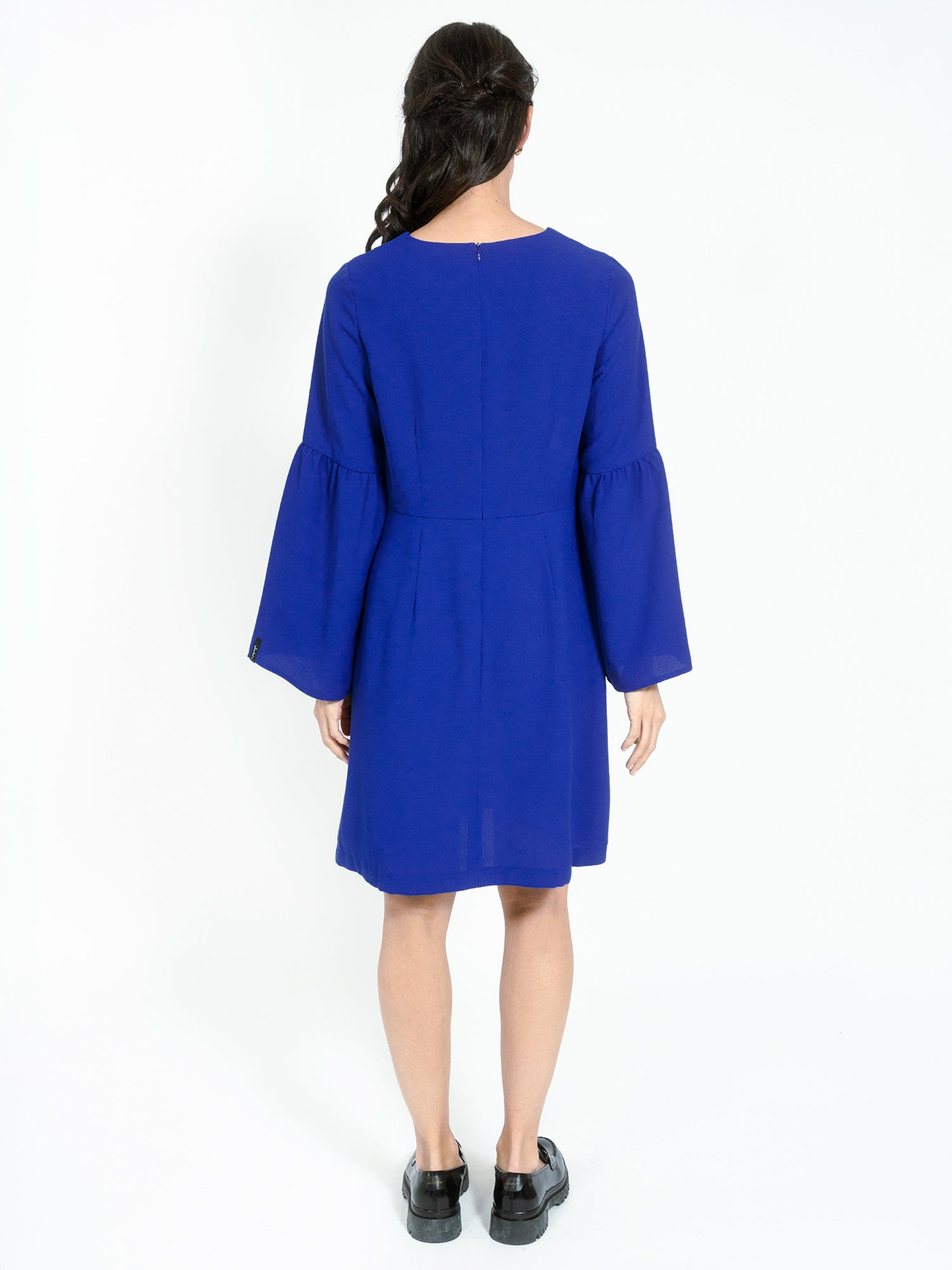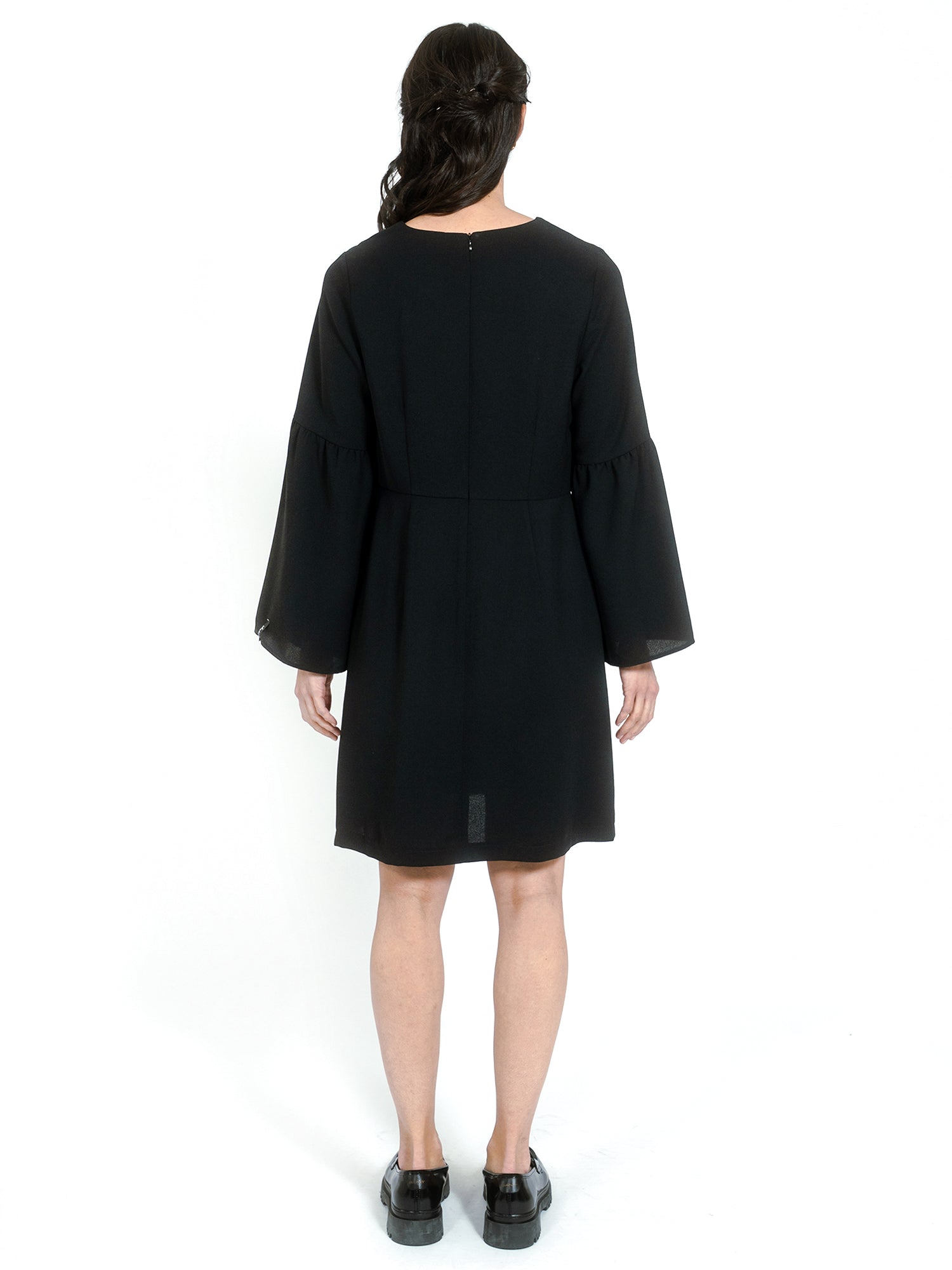 Knielanges Kleid aus weichem Recycling-Polyester von Jascha Stockholm. Leicht tailliertes Modell mit betonter Taille und langen, weiten Trompetenärmeln. Das Kleid hat einen verdeckten Reißverschluss am Rücken.