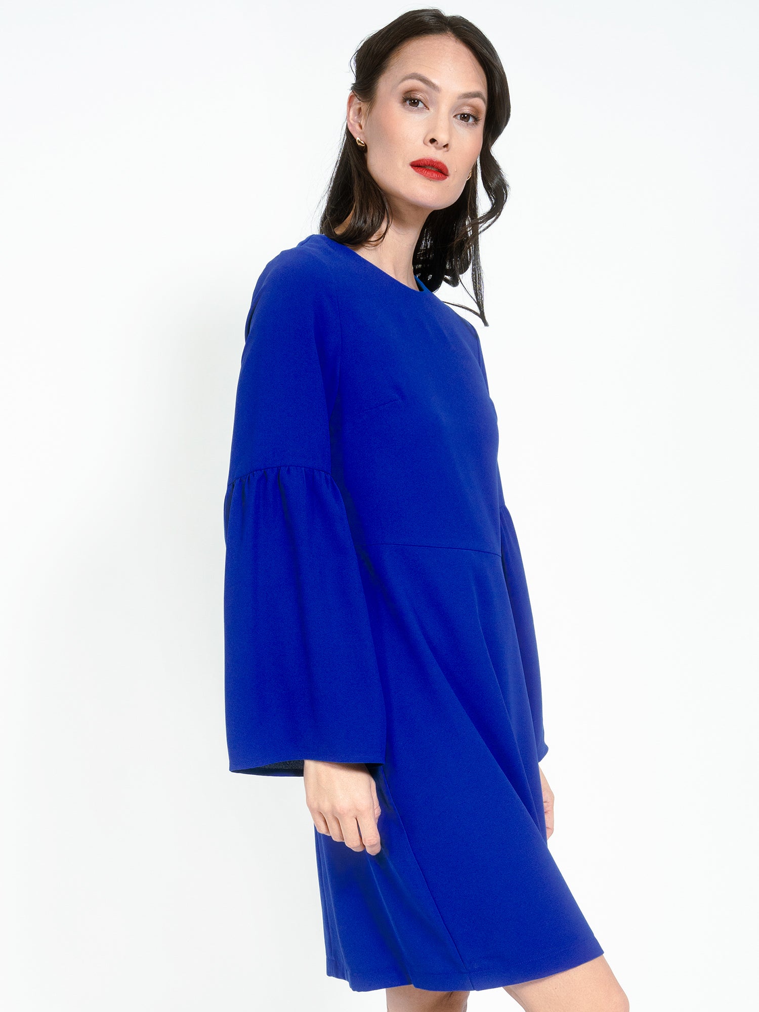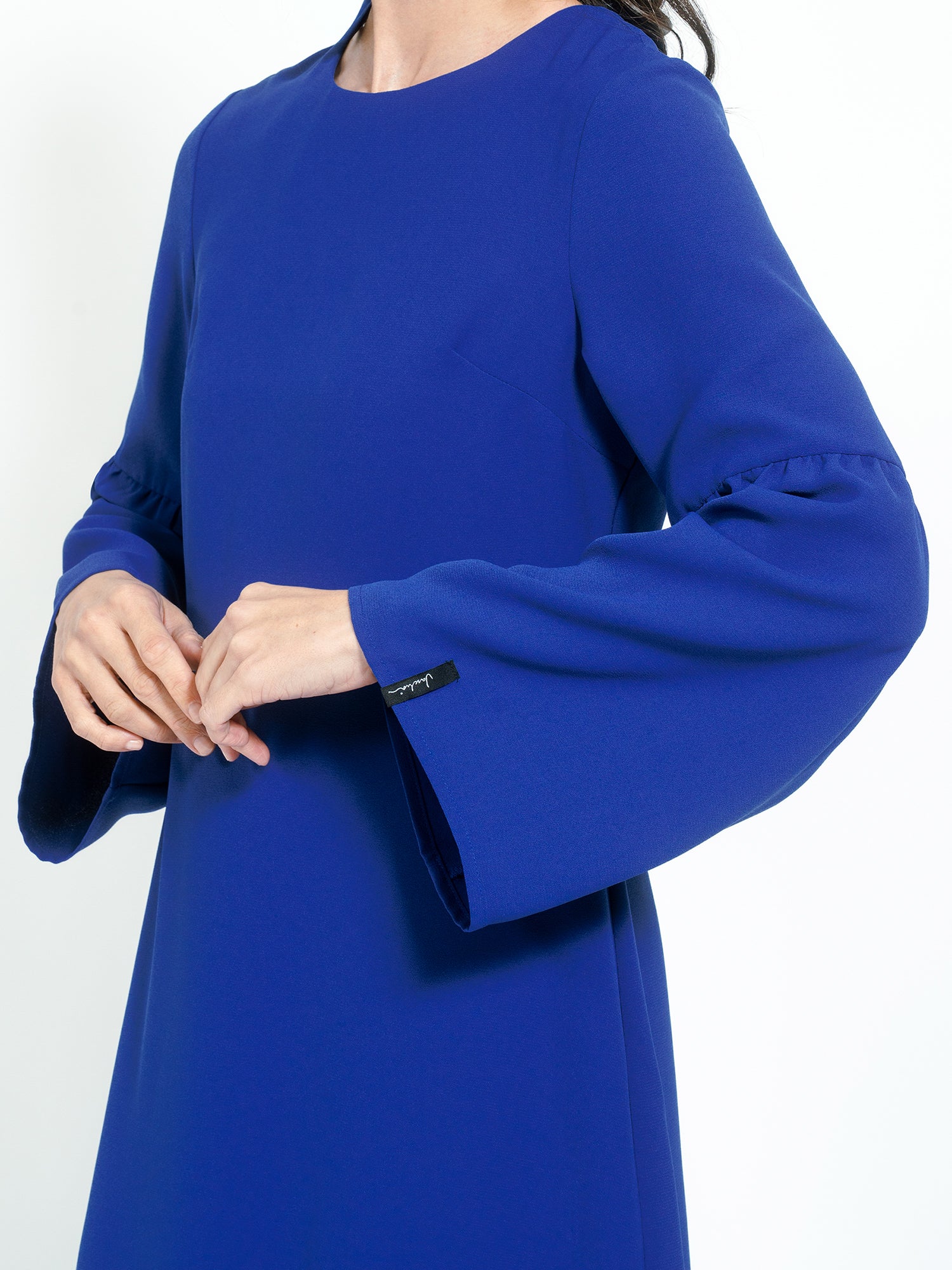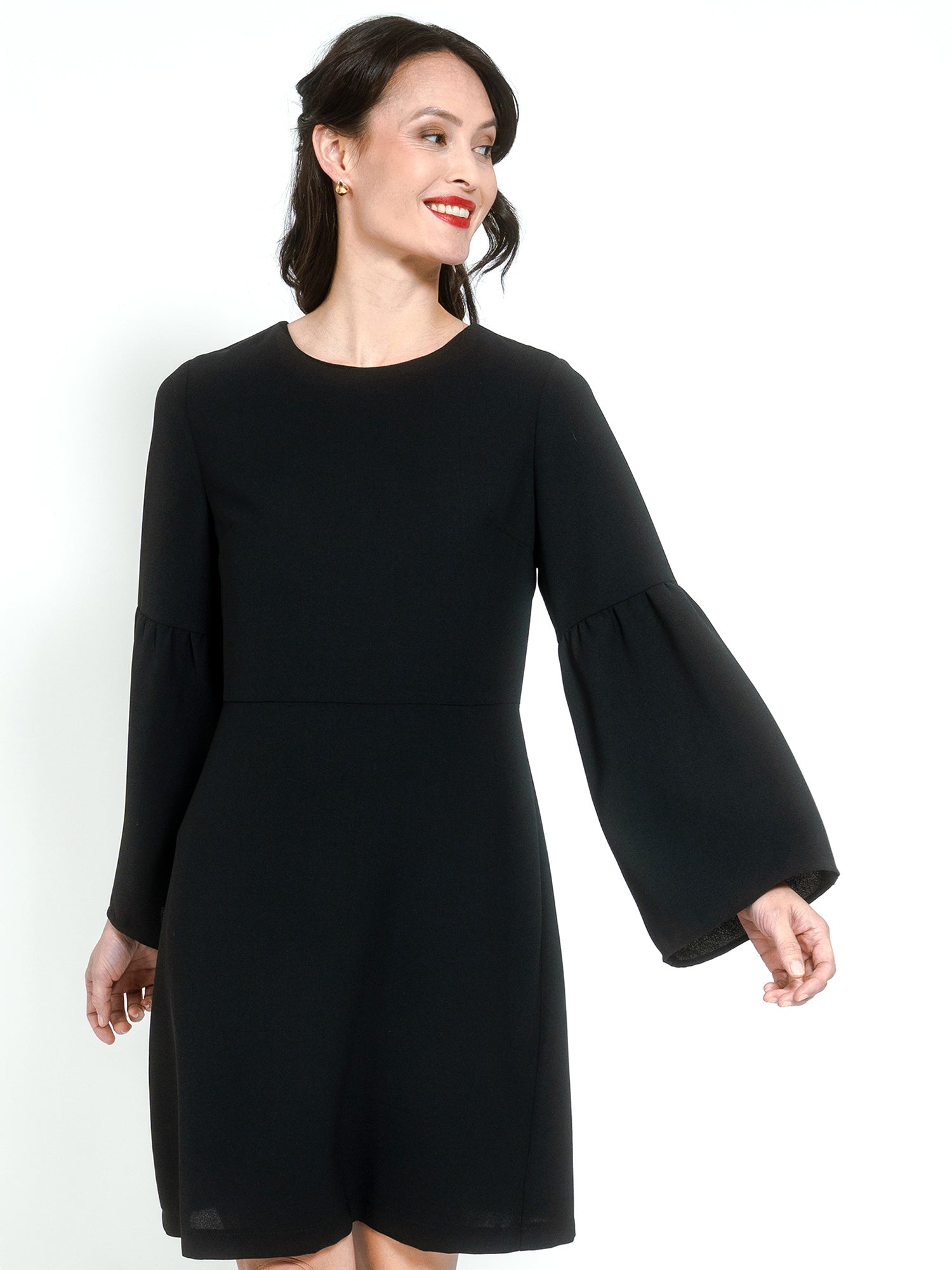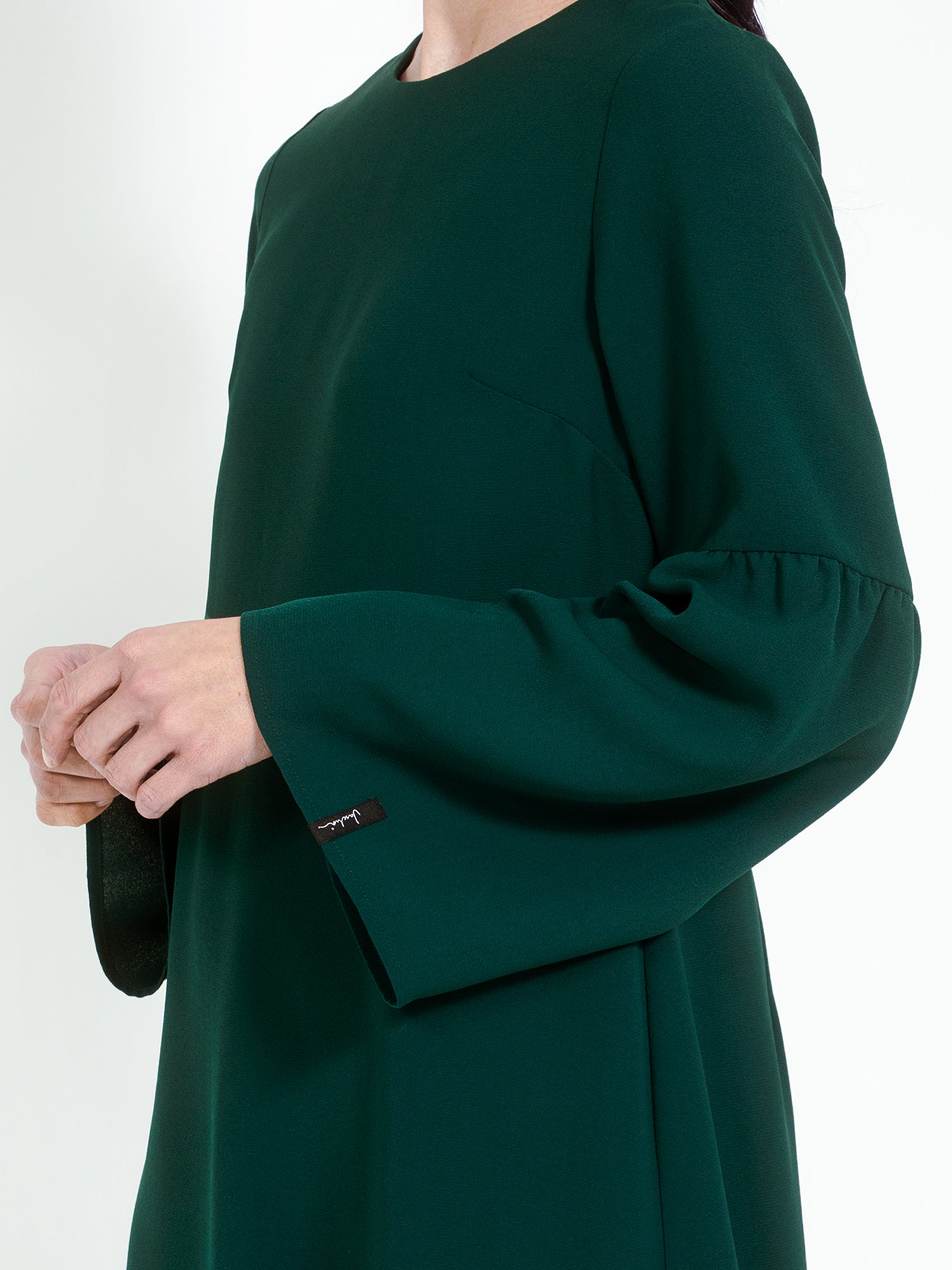 Knielanges Kleid aus weichem Recycling-Polyester von Jascha Stockholm. Leicht tailliertes Modell mit betonter Taille und langen, weiten Trompetenärmeln. Das Kleid hat einen verdeckten Reißverschluss am Rücken.