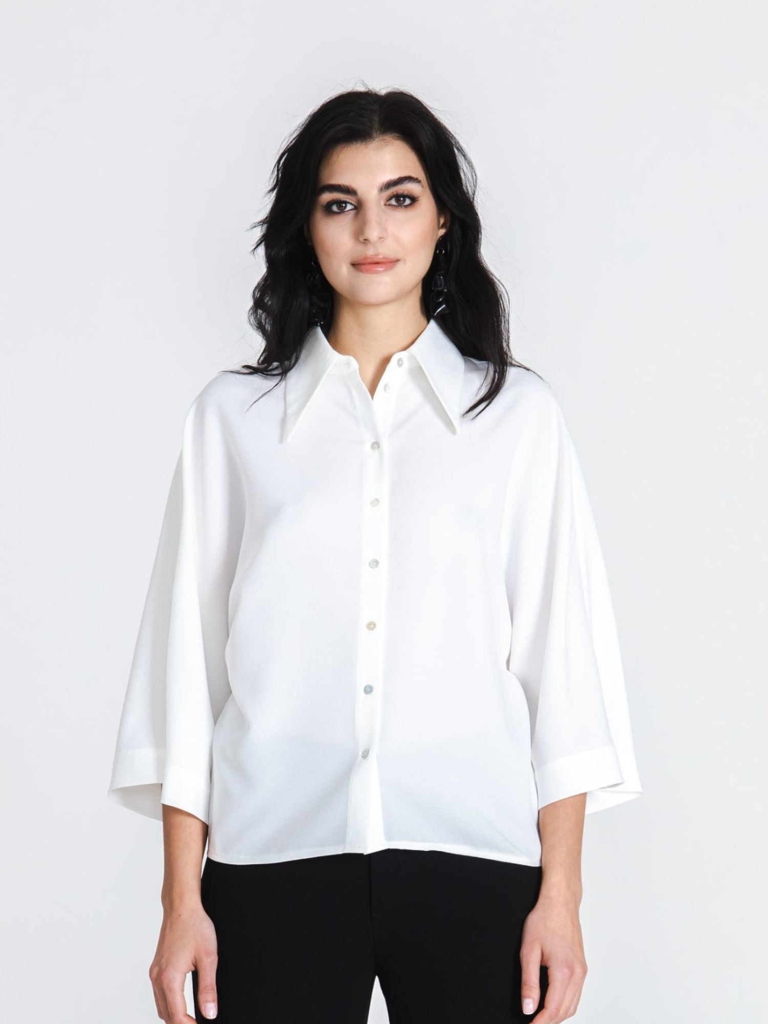 Recyceltes Hemdbluse aus weichem Polyester von Jascha Stockholm. Gerade geschnittenes Modell mit Knopfleiste vorne und dreiviertellangen, weit geschnittenen Ärmeln.