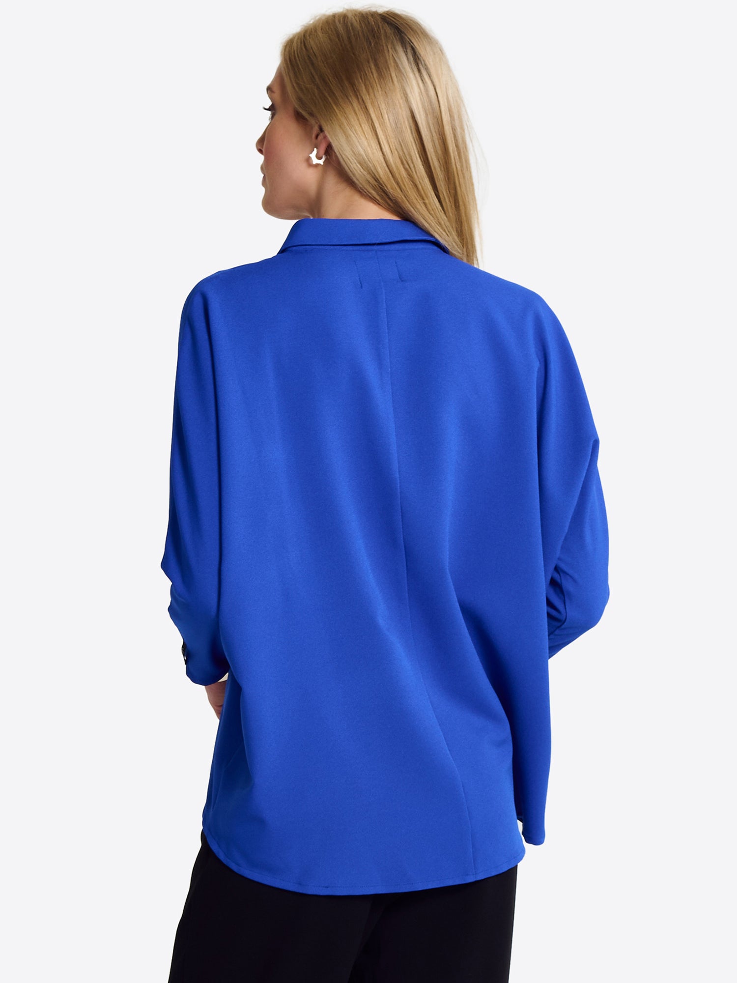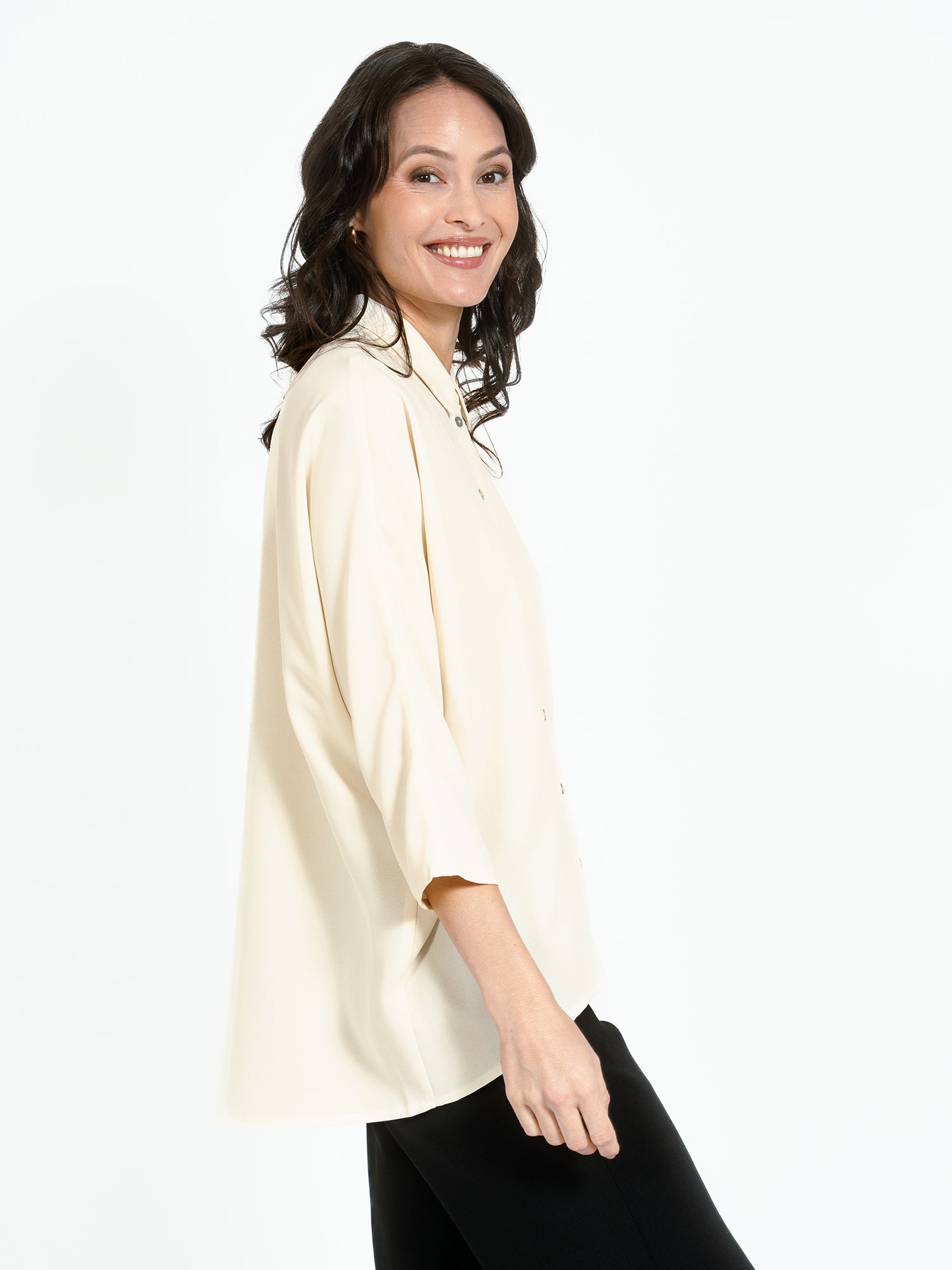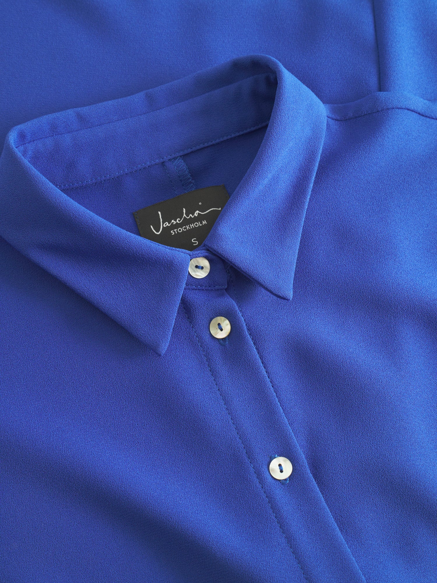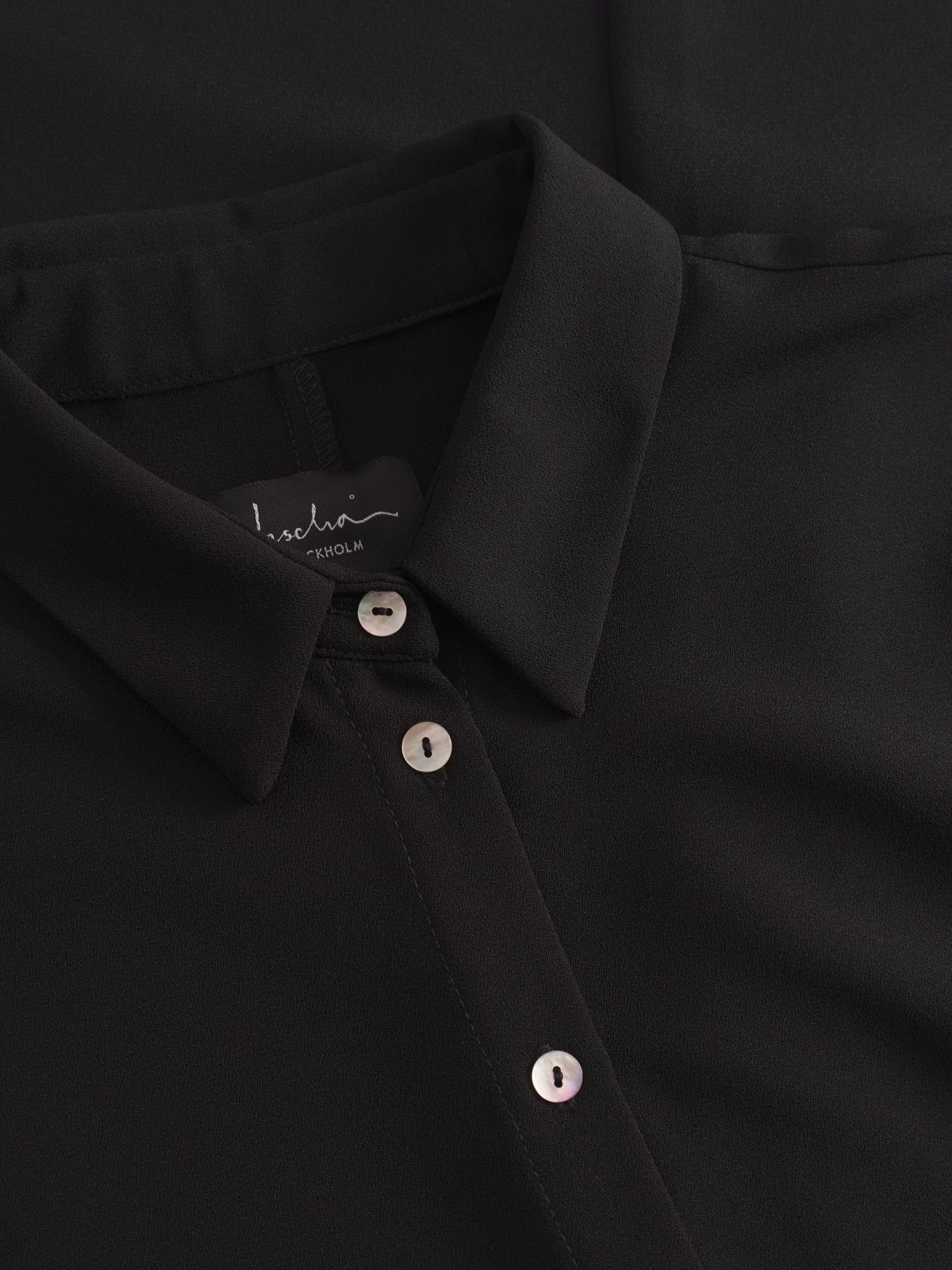 Hemd aus weichem Recycling-Polyester von Jascha Stockholm. Oversize-Modell mit Knopfleiste vorne und Dreiviertelärmeln. Das Hemd ist hinten etwas länger als vorne.